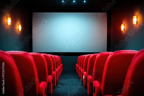 Empty movie theater with red seats and a bright blank screen, creating a calm cinema atmosphere