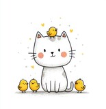 Cute White Cat With Yellow Chicks On White Background Cartoon Animal Illustration For Children's Designs And Spring Holiday Themes