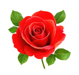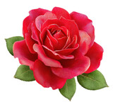 PNG vivid red rose with green leaves on white background for romantic floral art and design