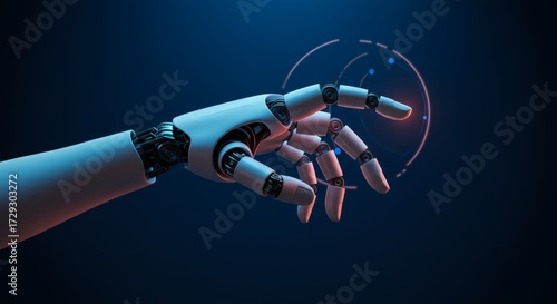 Human hand and robotic arm in a symbolic touch, representing technological partnership and innovation in business