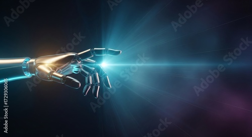 A shiny robotic hand extends forward with a glowing finger against a dark background, representing AI and future concepts. #1729306065
