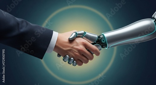 A human and a robot hand engaging in a handshake, symbolizing the merger of humanity and technology