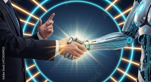 Businessman pointing at AI icon surrounded by futuristic digital networks