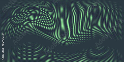 Wavy blue halftone pattern creating a flowing digital landscape with dotted grid on a blue background