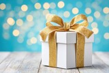 Elegant white gift box with gold ribbon on a wooden surface for festive celebrations