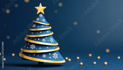 Blue Christmas tree with golden ribbons and star topper in a festive holiday scene