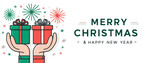 Hands hold Christmas gifts with fireworks and a cheerful Merry Christmas and Happy New Year message