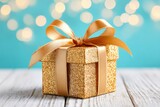 Elegant gold gift box with ribbon on a white wooden table for festive celebrations