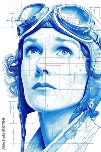 Woman aviator in detailed blueprint style illustration with intricate line designs