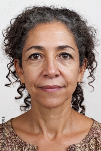 Photo ID portrait of middle-aged Colombian woman with dark curly hair, neutral background