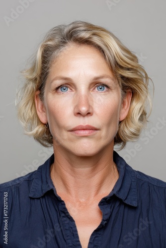 Front-facing photo ID portrait of a mature Czech woman with gray hair