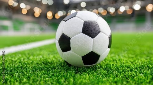 Close-up view of a soccer ball on lush green grass inside a stadium at night