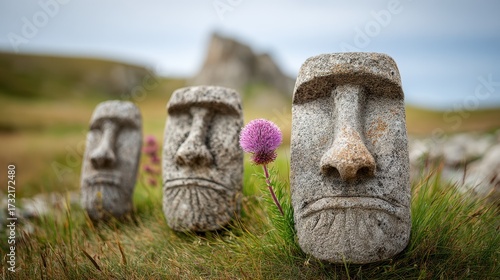 Ancient stone statues in a windswept field with a purple bloom between them, a calm and mysterious landscape