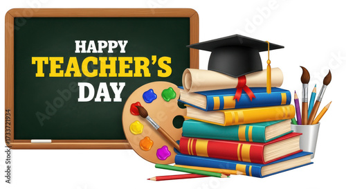 Happy teachers day message on a blackboard with a stack of books, graduation cap, and art supplies, isolated on transparent background #1733721934