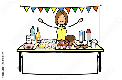 Frau steht mit Kuchen an Stand von Kuchenbarar vor leerem Banner