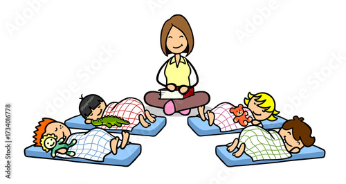 Gruppe Kinder macht Mittagsschlaf in Kita neben Erzieherin