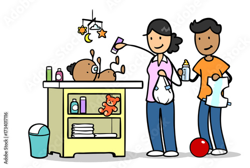Vater und Mutter wickeln zusammen ihr Baby mit frischer Windel
