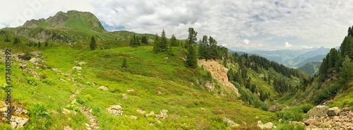 Majestic mountain panorama with lush green landscapes and dramatic cloudy skies
