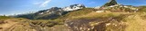 Panoramic view of alpine landscape with snow capped mountains and clear stream