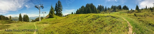 Panoramic view of lush green mountain meadow with blue sky and cableway