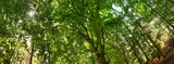Panoramic lush green forest canopy with sunlight filtering through leaves