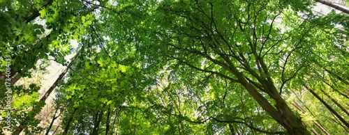 Panoramic view of a vibrant forest canopy with lush green leaves