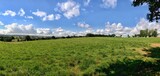 Wide panoramic view of a grassy field under a vibrant blue sky