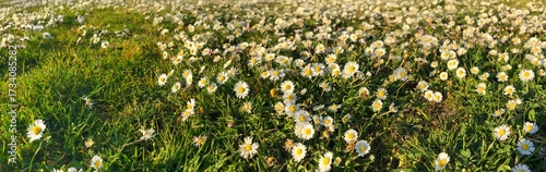 Wide panorama of a daisy field with sunlight embracing the flowers
