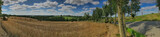 Panoramic landscape with rural fields, trees and hay bales under a blue sky