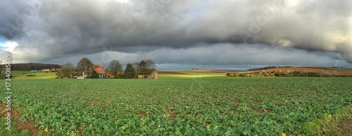 Rural farmland with cloudy sky in a wide panoramic landscape