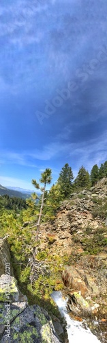Panoramic view of lush green forest and rocky hillside with vibrant vegetation