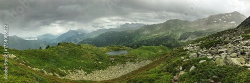 Panoramic mountain landscape featuring lush greenery and moody weather conditions