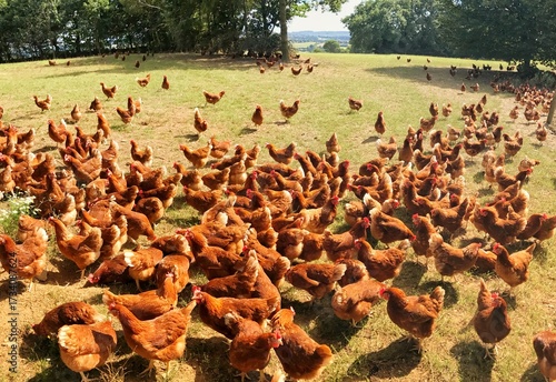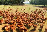 Chicken wandering through grass during a vibrant sunset on a rural farm