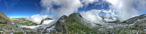 Panorama of a mountain landscape with clouds, snowfields, and rocky terrain