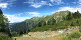 Scenic mountain landscape panorama with lush greenery and vibrant blue skies