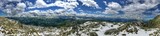 Panoramic view of a mountainous landscape with clouds and snow-covered terrains