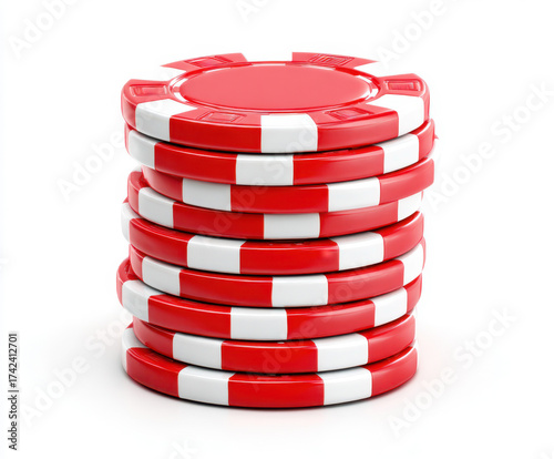 Stack of red poker chips with white bands and a single large chip leaning against them, suggesting betting, gambling, and winnings