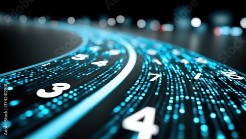 Futuristic blue highway curves into a neon night glow filled with numbers and symbols