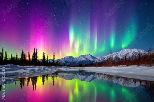 Breathtaking night landscape with aurora over snow covered mountains and calm reflective lake