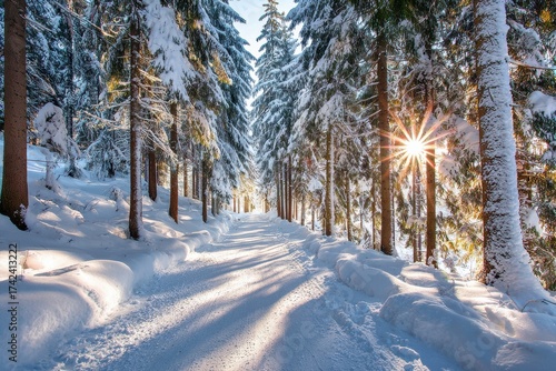 Snowy forest path bathed in sunlight between tall pine trees in winter