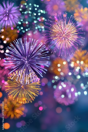 Colorful fireworks light up the night sky with purple and gold bursts for a festive celebration
