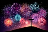 Cross on a hill under a vibrant fireworks display at night sky