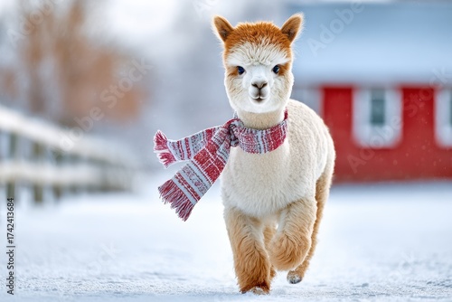 Cute alpaca wearing a red and white scarf trots through snowy field near a red barn in winter