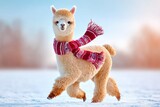 Cute alpaca running in the snow wearing a red scarf, a cheerful winter moment