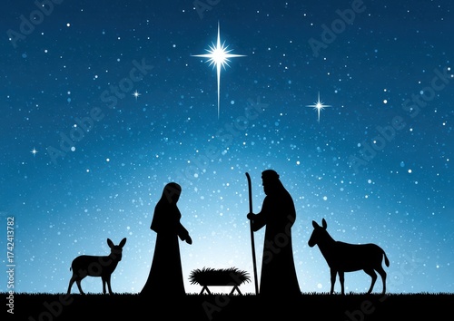 Silhouette of nativity scene with Mary, Joseph, and baby Jesus