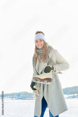 Junge Frau mit Schlittschuhen lächelt glücklich