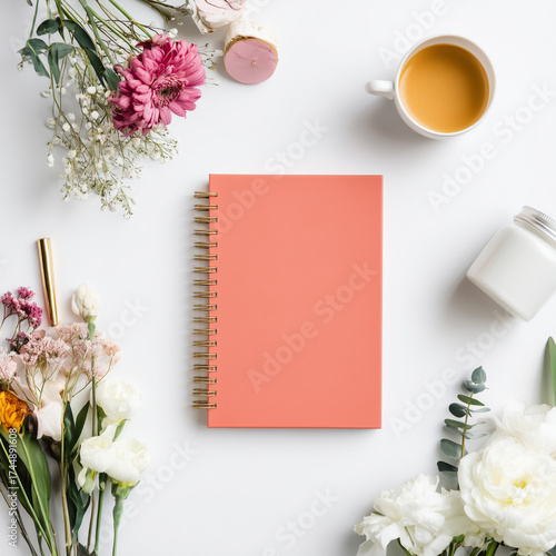 Open blank notebook surrounded by pink flowers on a pastel pink background