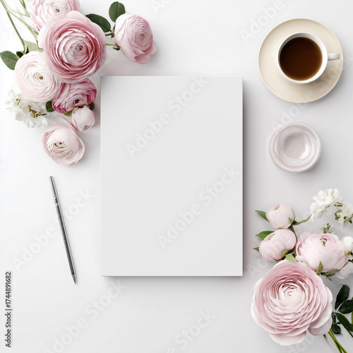 Elegant peach roses with blank card on pink textured background