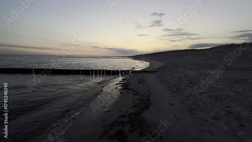Tracking shot of sunset over the Baltic Sea: tranquil beach scene in Graal-Müritz, Germany.
