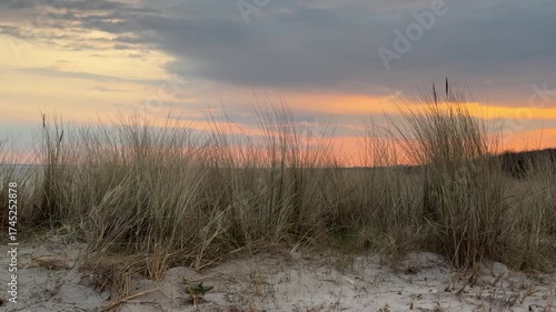 Pan shot of sunset over the Baltic Sea: beach, sand dunes, and beach grass at Graal-Müritz, Germany.